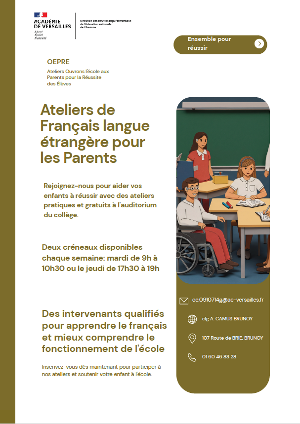 Dans le cadre de l’accompagnement à la réussite des élèves, le Collège Albert Camus de Brunoy propose aux parents des ateliers de Français Langue Étrangère (FLE). Ces ateliers sont destinés aux parents qui souhaitent améliorer leur maîtrise de la langue (...)